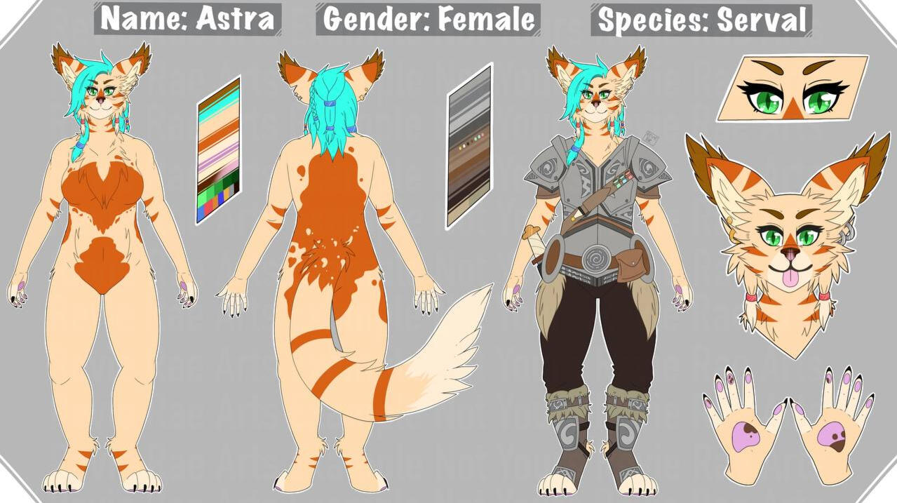 Reference sheets include a front and back view and 2 simple close up details (such as eyes, hands and tail) as standard. Additional details can be added for an extra fee.2 view reference sheet: £80